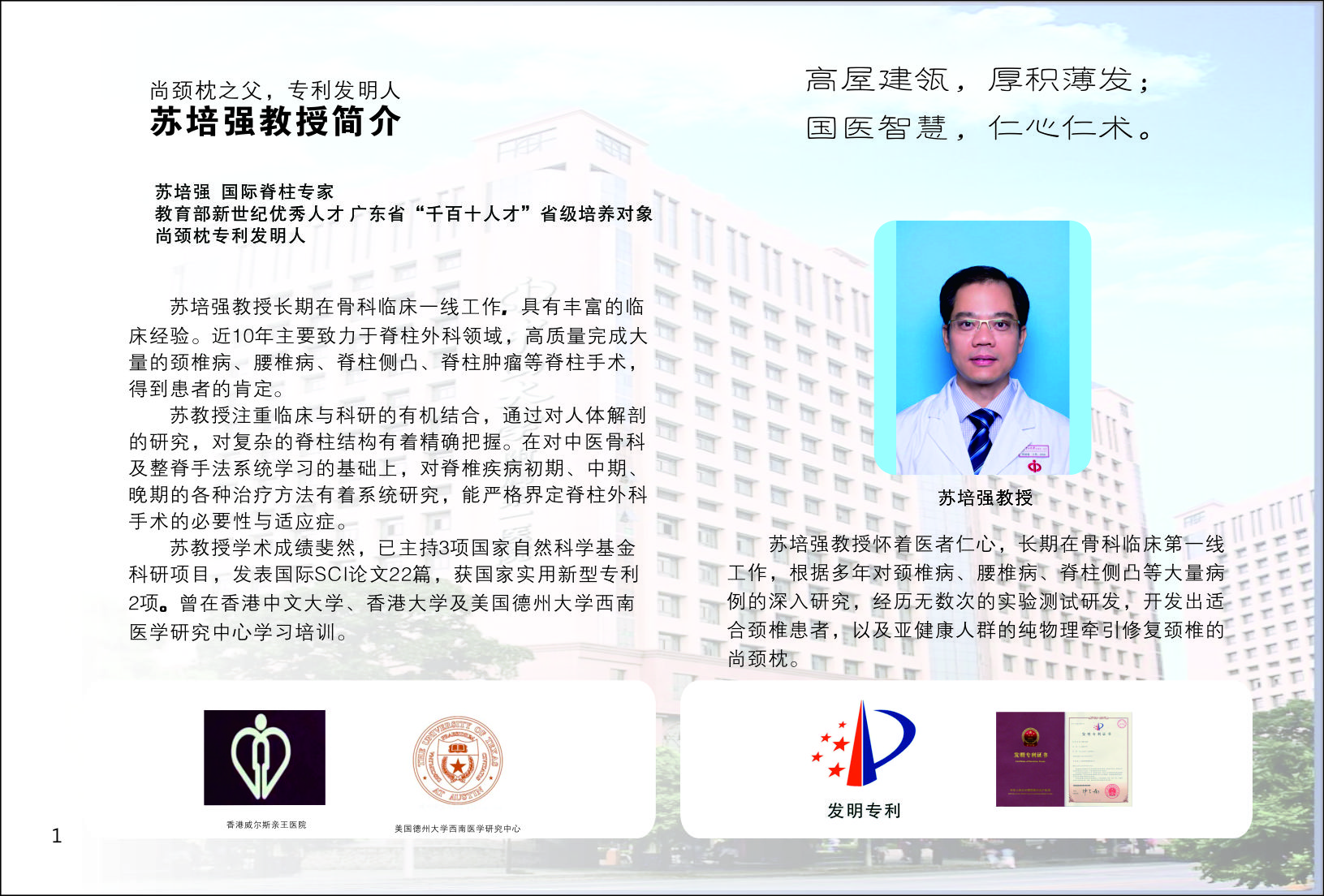 国际资深脊柱外科专家苏培强教授怀着医者仁心,大医大爱精神,通过多年对颈椎病患者的临床观察、治疗及发病机制研究,自主研发出诊断颈椎病初期患者及亚健康人士的纯物理牵引颈椎舒展枕-尚颈枕。尚颈椎纯物理牵引是能够被颈椎病初期患者及颈椎病高危人群长期坚持和使用的良好保健及治疗方式。秉承中华医学“上医医未病之病,中医医欲病之病,下医医已病之病”的“防病防变”的国医智慧,“尚颈枕”的发明,解决了这一全球化的颈椎保健难题,为全球9亿多颈椎病患者带来福音。